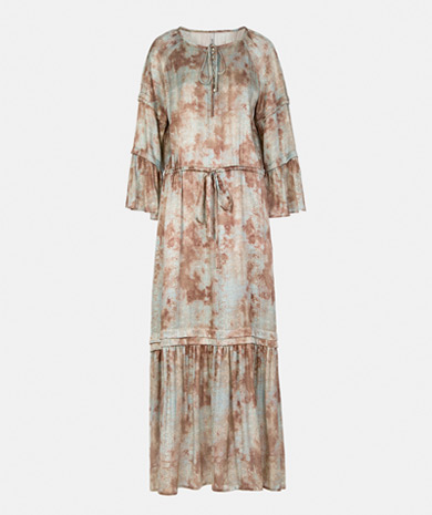 Vestido comprido com estampado tropical. Decote em bico, maga curta com folho, cinto e forro. Fecho invisível nas costas.