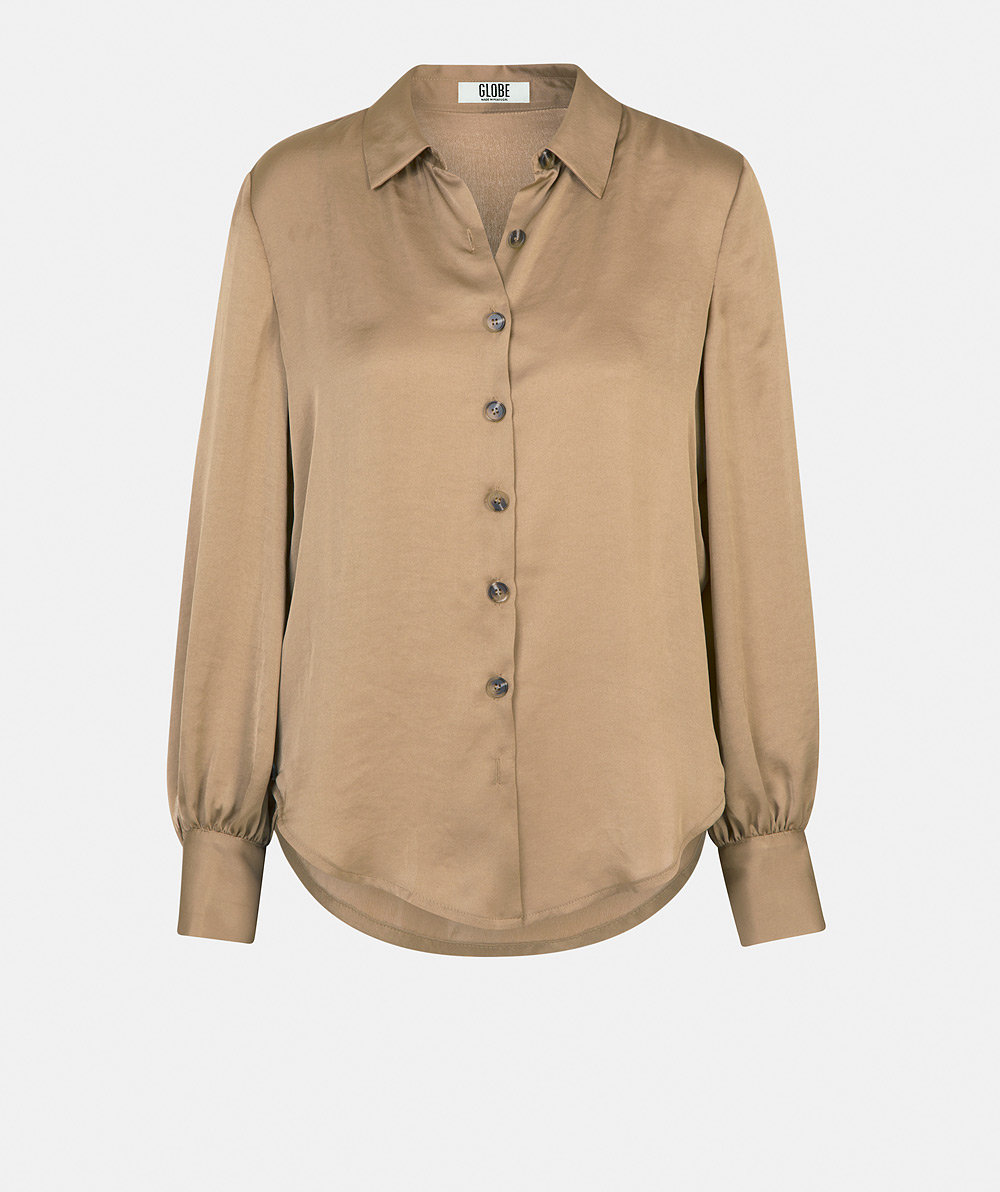 Camisa acetinada com gola clássica e fecho de botões. Manga comprida, punho com botão e parte inferior arredondada.