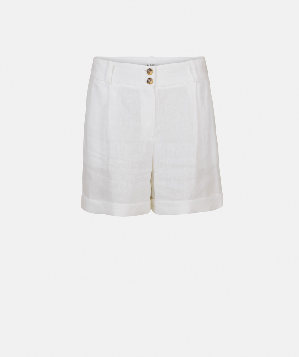 Calções lisos, confeccionados em 100% linho. Presilhas, fecho de corre com carcela e botões e bolsos.